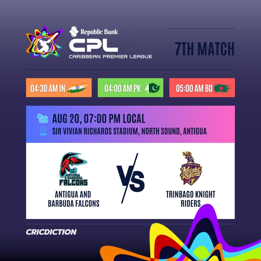 The Caribbean Premier League 2025 is set to witness an exciting clash between Antigua and Barbuda Falcons (ABF) and Trinbago Knight Riders (TKR) in their 7th match at the Sir Vivian Richards Stadium on Wednesday, August 20. Both teams are gearing up to showcase their skills and compete fiercely for a victory.