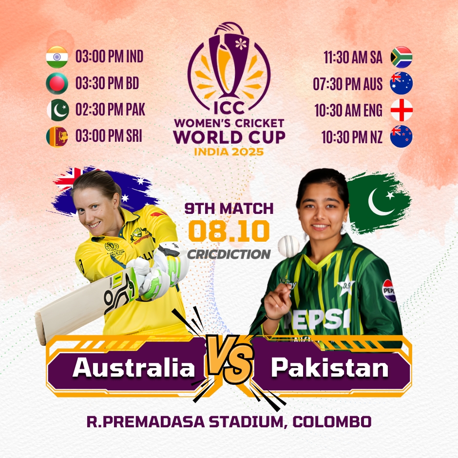 The highly anticipated 9th match of the ICC Women’s World Cup 2025 is set to take place between Australia Women and Pakistan Women, also known as AUS-W vs PAK-W. This thrilling encounter is scheduled for October 8th at the R.Premadasa Stadium in Colombo, with the kick-off at 09:30 am GMT, 03:00 pm IST, and 03:00 pm local time.