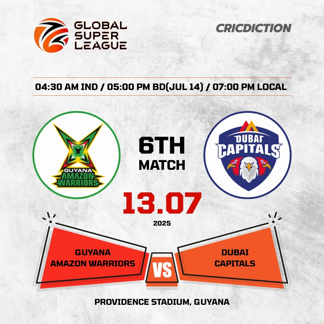 Guyana Amazon Warriors (GAW) are gearing up to face Dubai Capitals (DC) in their 6th match of the Global Super League, 2025. Scheduled to take place at the Providence Stadium on Sunday, July 13.