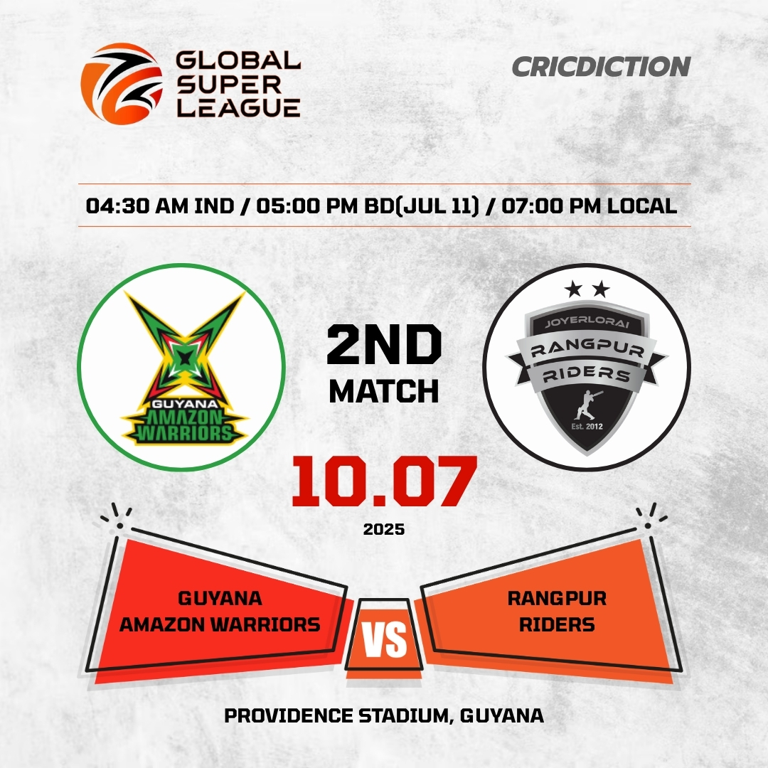 This Thursday, July 10, the Guyana Amazon Warriors will take on the Rangpur Riders in their second match of the Global Super League, 2025 at Providence Stadium, Guyana.