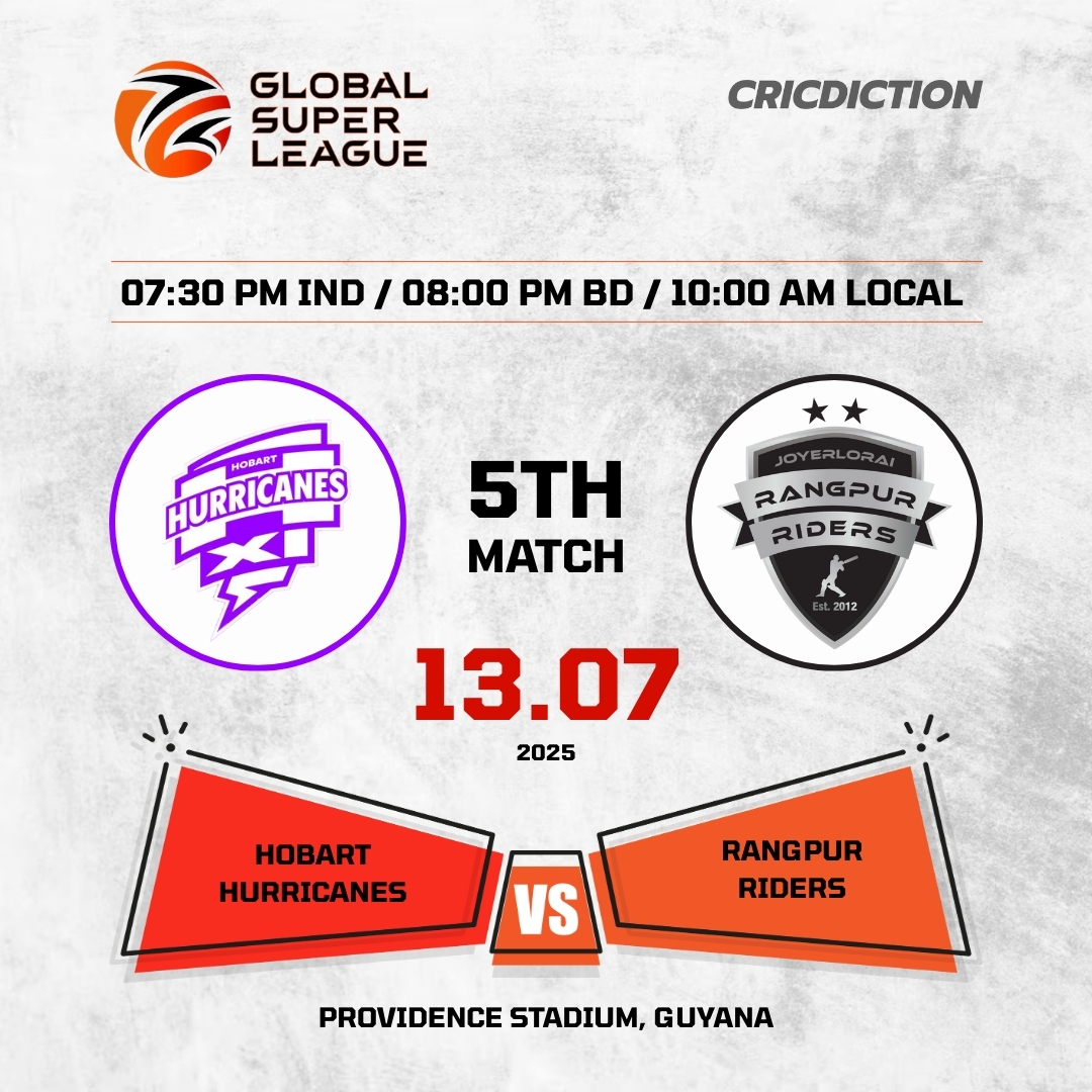 Hobart Hurricanes are gearing up to face off against Rangpur Riders in their upcoming match in the Global Super League, 2025. This exciting clash is scheduled to take place at the Providence Stadium in Guyana on Sunday, July 13th.