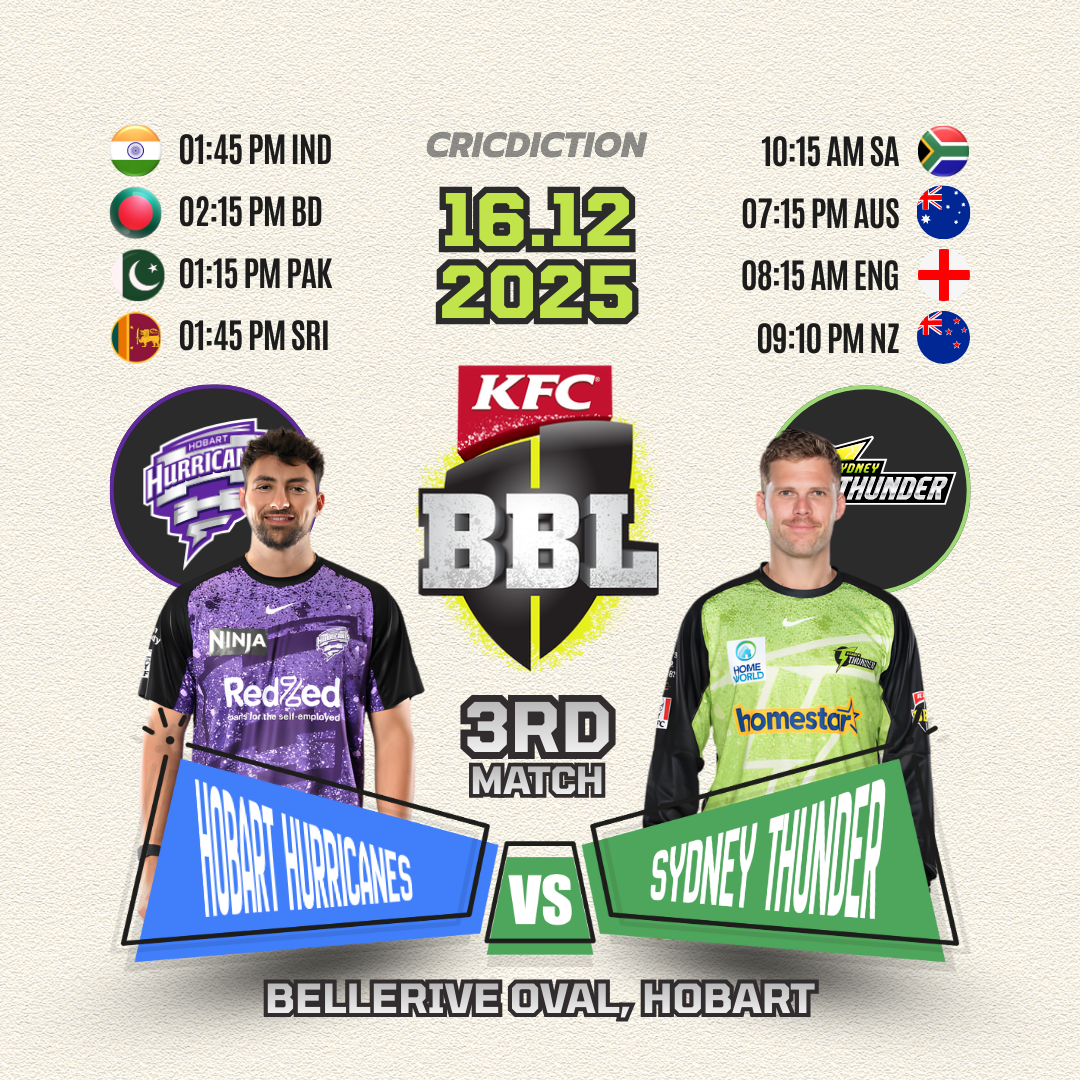 Get ready for an exciting showdown between the Hobart Hurricanes and the Sydney Thunder in the 3rd match of the Big Bash League 2025-26. The match is scheduled to take place on December 16 at 08:15 am GMT / 01:45 pm IST / 07:15 pm local time at the Bellerive Oval in Hobart.