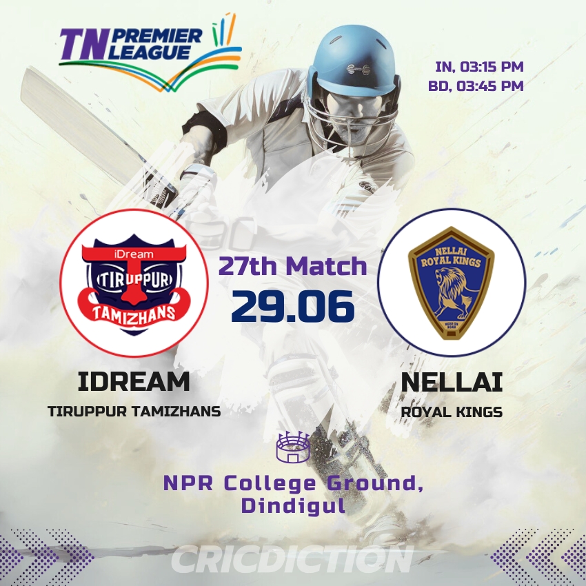 In what promises to be an exciting encounter, IDream Tiruppur Tamizhans will face off against Nellai Royal Kings in the 27th match of the Tamil Nadu Premier League 2025 at the NPR College Ground in Dindigul on Sunday, June 29.