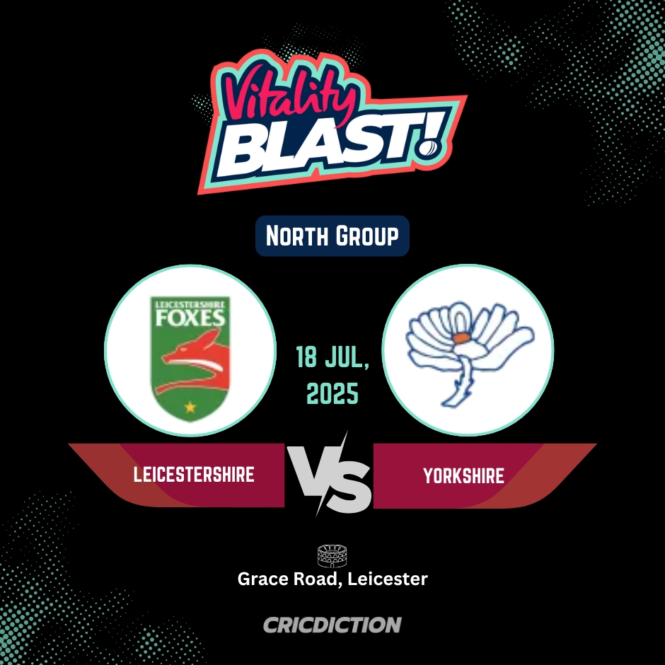 Don’t miss this exciting clash between Leicestershire and Yorkshire in the T20 Blast 2025. Stay tuned for all the live action and updates from Grace Road on July 18!