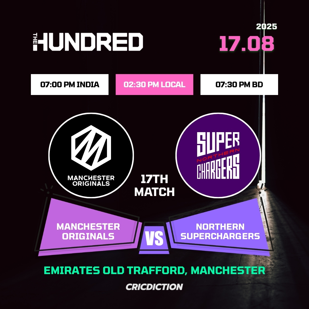 Manchester Originals (MO) are gearing up to take on Northern Superchargers (NSC) in the 17th match of The Hundred Mens Competition 2025. The highly anticipated match is set to be held at Emirates Old Trafford on Sunday, August 17.