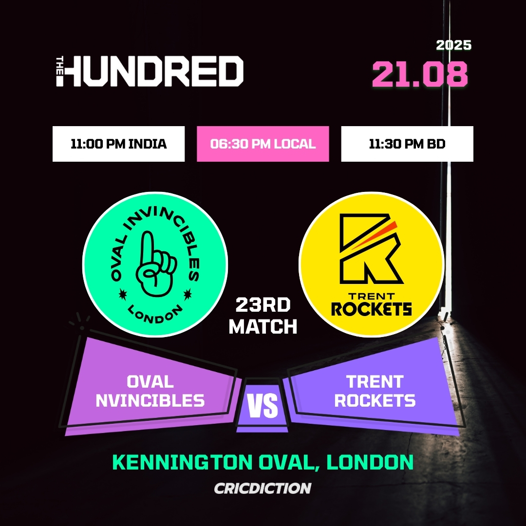 Stay tuned for more updates on the Oval Invincibles vs Trent Rockets match in The Hundred Men’s Competition 2025.