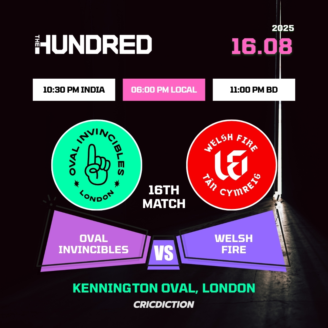 Get ready for an action-packed clash as Oval Invincibles (OI) gear up to take on Welsh Fire (WF) in their 16th match during The Hundred Men’s Competition 2025. The highly anticipated game is set to unfold at the historic Kennington Oval in London on Saturday, August 16 at 05:00 pm GMT.