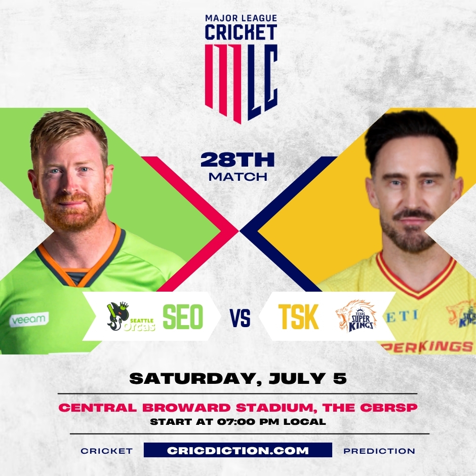 Seattle Orcas (SEO) is gearing up to take on Texas Super Kings (TSK) in their 28th match of the Major League Cricket 2025 season. The exciting clash is set to unfold at the Central Broward Regional Park Stadium Turf Ground in Lauderhill on Saturday, July 05.