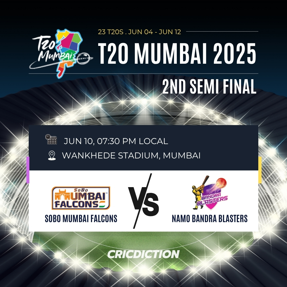 The exciting clash between SoBo Mumbai Falcons (SBMF) and NaMo Bandra Blasters (NMBB) in the 2nd Semi Final of T20 Mumbai 2025 is set to take place at the iconic Wankhede Stadium on Tuesday, June 10. Both teams will be looking to secure a spot in the final with a stellar performance in this crucial encounter.