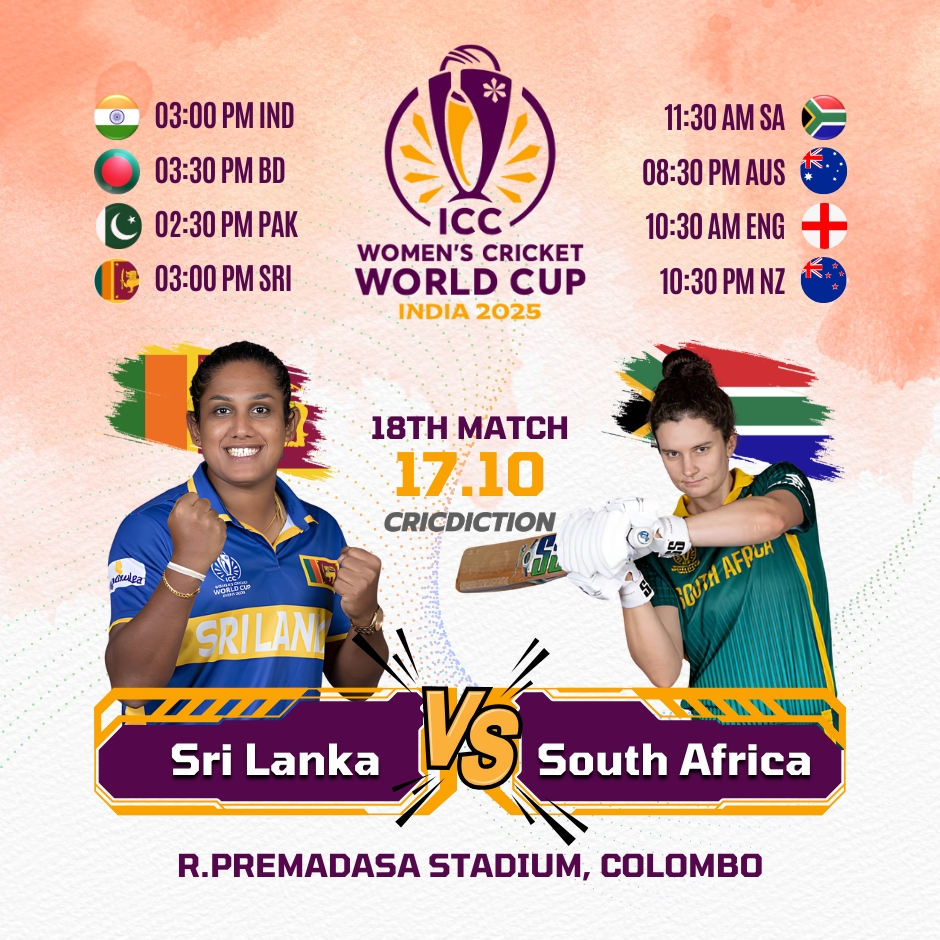 The Sri Lanka Women’s team is set to face off against the South Africa Women’s team in the 18th match of the ICC Women’s World Cup 2025. The highly anticipated match is scheduled to take place on October 17 at the R.Premadasa Stadium in Colombo. The match will kick off at 09:30 am GMT, 03:30 pm BD, and 03:00 pm local time.