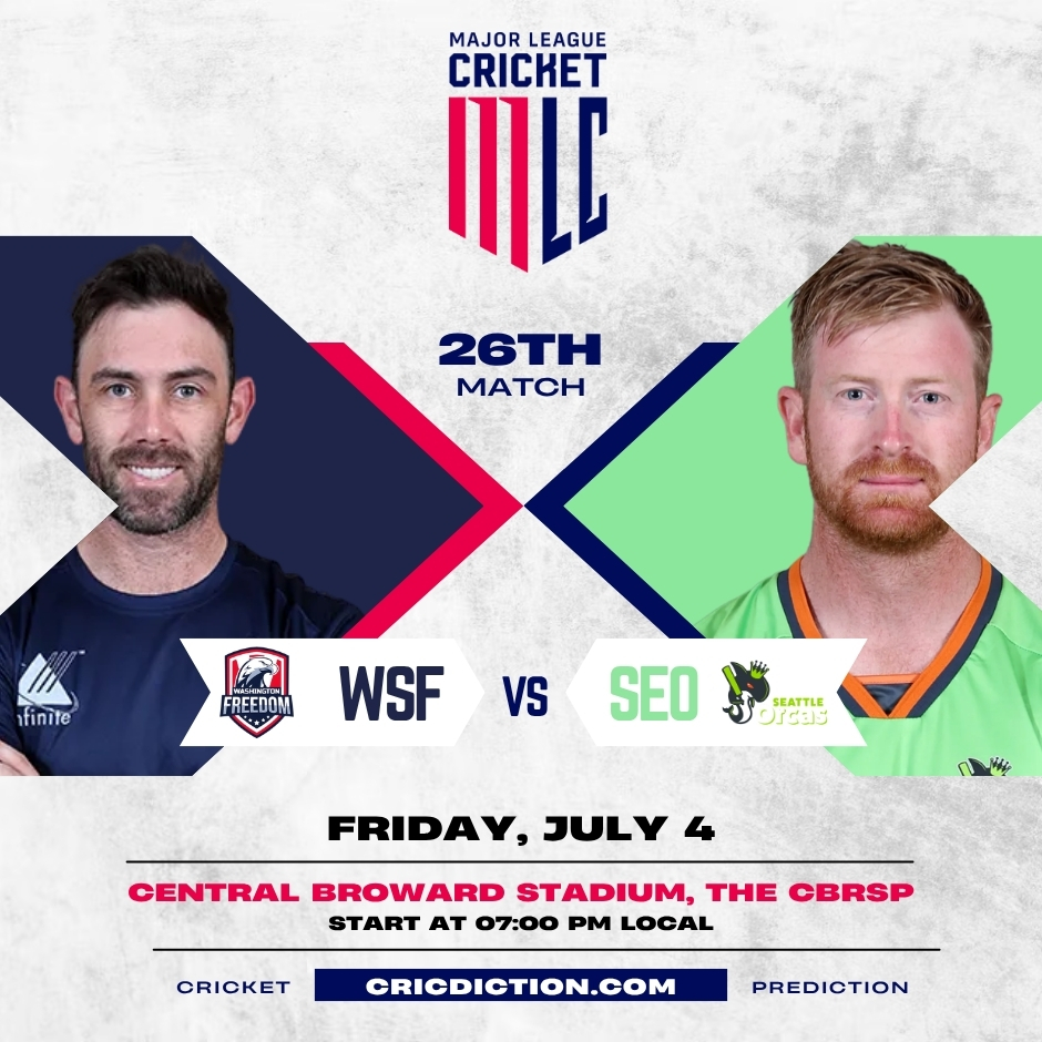 Washington Freedom(WSF) is gearing up to take on Seattle Orcas(SEO) in their 26th match of the Major League Cricket 2025. The match is set to be held at the Central Broward Regional Park Stadium Turf Ground, Lauderhill on Friday, July 04.